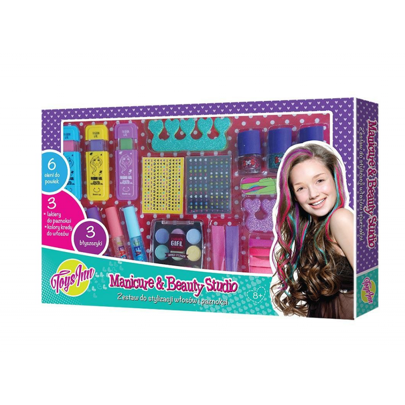 Zestaw do stylizacji włosów i paznokci zawiera: 3 lakiery do paznokci, naklejki na paznokcie, 3 błyszczyki do ust, kreda do włosów w 3 kolorach, cienie do powiek w 6 kolorach, 6 gumek do włosów, 2 pianki do pedicure, 2 tasiemki oraz pilniczek. Zaszalej z kolorami, daj się ponieść wyobraźni, spędź z mamą lub z przyjaciółką wspólnie czas na malowaniu paznokci i kolorowaniu włosów.