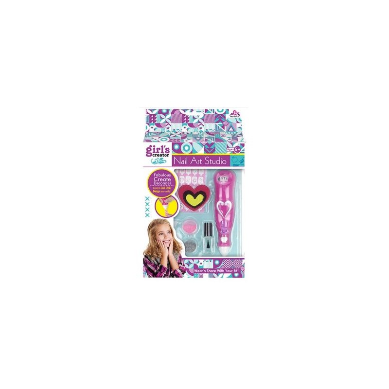 Zestaw do ozdabiania paznokci, a w nim: pisak do zdobienia, kolorowe brokaty, lakier, pilniczek w kształcie serca, szablony wzorów na paznokcie.