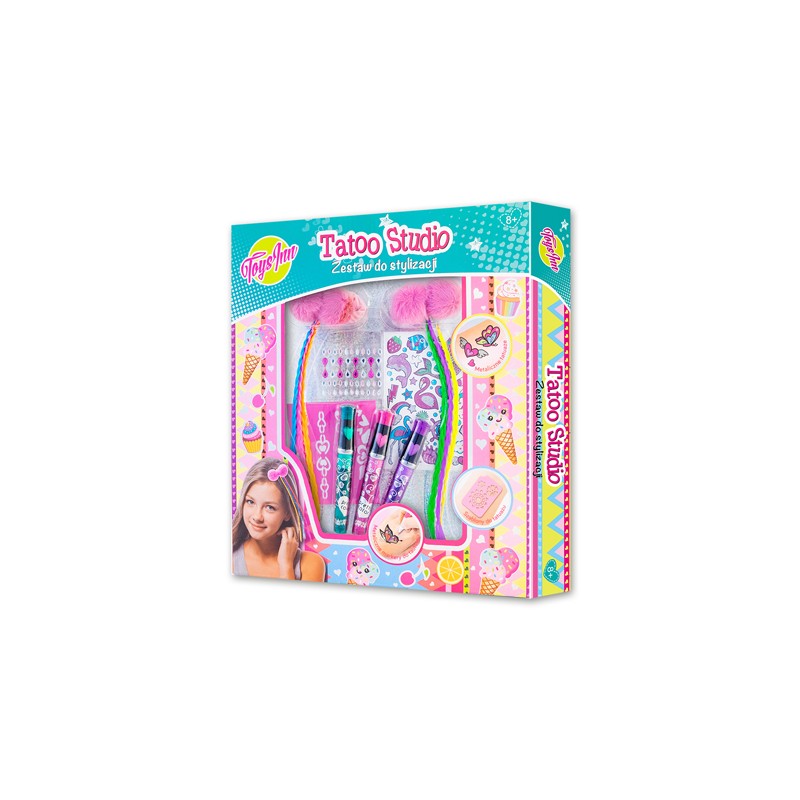 Super zestaw Tatoo Studio został stworzony dla wszystkich dziewczynek, które chcą być modne i lubią się wyróżniać. W zestawie:: 2 dekoracyjne gumki do włosów z pomponem i kolorowymi warkoczykami, 3 metaliczne markery do tatuażu, 1 arkusz metalicznych tatuaży,1 arkusz szablonów do tatuażu, 1 arkusz naklejek kryształków. Rozwiń swoją pomysłowość i kreatywność, stwórz swój własny niepowtarzalny look. Wiek 8+.