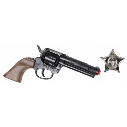 estaw dla prawdziwego kowboja: rewolwer kowbojski na naboje z bębenkiem ( 8 szt.), odznaka, całość ładnie zapakowana. Solidna jakość wykonania, fajny zestaw na prezent. Wiek 3+.
