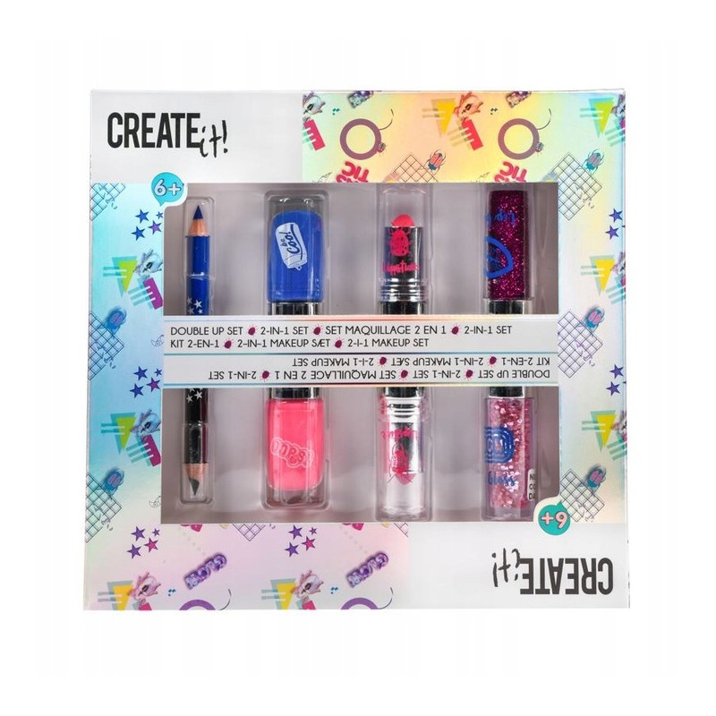 Zestaw zawiera: podwójny pachnący błyszczyk do ust, podwójna pachnąca szminka, podwójny lakier do paznokci, podwójna kredka do oczu. Idealny zestaw dla małej modnisi. Wiek 6+.