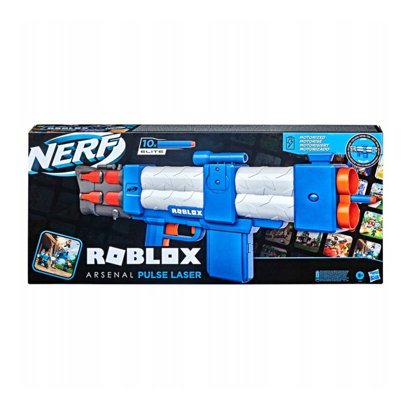 Wyrzutnia strzałek Nerf Roblox Arsenal: Pulse Laser inspirowana grą Roblox. Do wyrzutni dołączono specjalny kod, który pozwala uzyskać wyjątkowy przedmiot wirtualny na platformie Roblox. Wyposażona jest w funkcję zautomatyzowanego strzelania i wyjmowany 10-strzałkowy magazynek. Dołączono 10 oryginalnych strzałek Nerf Elite. Wystrzeliwuj 10 strzałek z rzędu, zanim przyjdzie czas na przeładowanie! Aby rozpocząć strzelanie, włóż magazynek do wyrzutni, przytrzymaj przycisk przyspieszenia, by włączyć silnik, a następnie naciśnij spust, by wystrzelić strzałkę w powietrze. Zalecane jest stosowanie okularów (nie dołączono). Wymagane 4 baterie AA 1,5 V (nie dołączono).