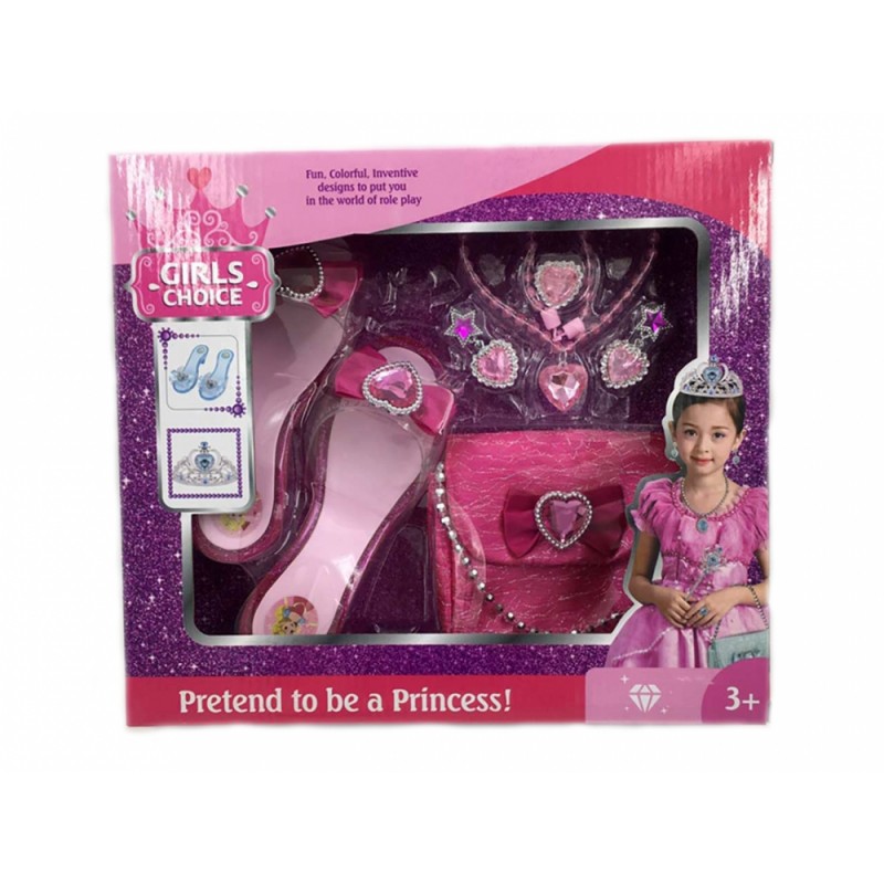 Piękny zestaw dla małej księżniczki: torebka pantofelki, naszyjnik, kolczyki, pierścionek. Idealne dla małej modnisi, która kocha przebieranki. Wiek 3+.