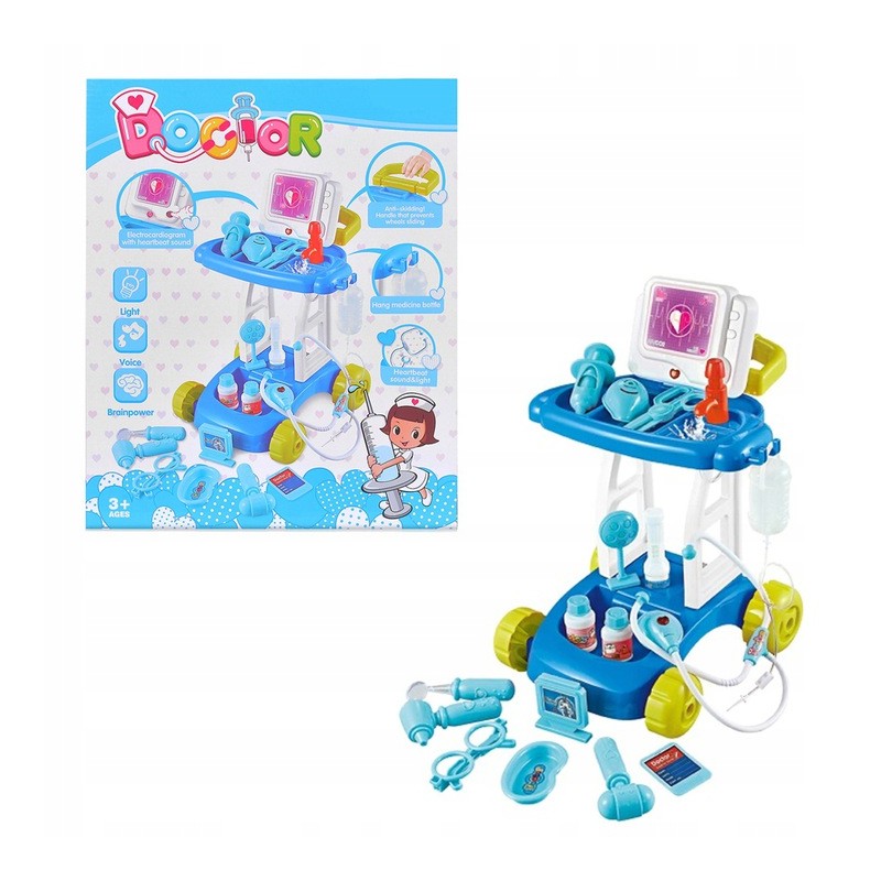 Zestaw składa się z 15 elementów oraz wózka diagnostycznego i pozwala dziecku zapoznać się z podstawowym sprzętem medycznym. Nauka przez zabawę. W zestawie: