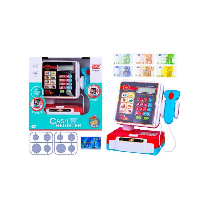Kasa sklepowa z panelem dotykowym, mała 5373 Kasa sklepowa z dotykowym panelem, elektronicznym wyświetlaczem, klikającym skanerem produktów i czytnikiem kart oraz wysuwaną kasetką na pieniądze. W zestawie: koszyk na zakupy, produkty: sałata, pomidor, gruszka, kartonowe pudełko - suszone owoce, pieniądze, monety oraz karta płatnicza. Baterie: 2 x 1,5V AA - nie załączono Wymiary opakowania: 33 x 20 x 16 cm. Zabawka, która zaznajamia z wartością pieniądza, rozwija wyobraźnię. Wiek: 3+.