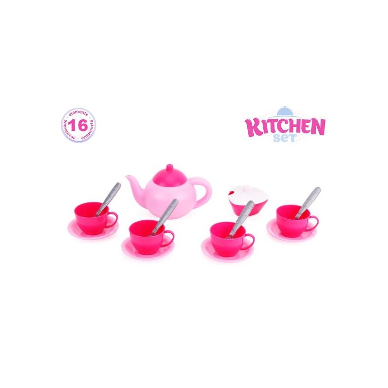 Zestaw naczyń do herbaty, wykonany z dobrej jakości plastiku w kolorze różowym. W zestawie znajduje się: czajniczek, cukierniczka, filiżanki 4x, talerzyki 4x, łyżeczki 4x.