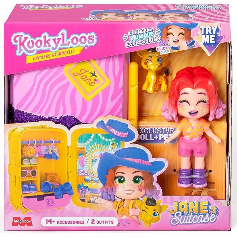 Walizka Jane to nie tylko miejsce na ubrania, ale właściwie w pełni profesjonalna garderoba, w której bohaterka może spędzać najlepsze chwile na wybieraniu poszczególnych elementów swoich stylizacji. Laleczka Jane ma jasną karnację, a jej czerwono - różowe włosy idealnie komponują się z całą stylizacją! Ta bohaterka właśnie wybiera się w podróż i najpewniej sporo czasu spędzi na safari, podziwiając dzikie zwierzęta. Walizeczka jest oczywiście otwierana, ma drążek na wieszaki oraz szufladkę na drobne bibeloty. Laleczka ma wymienne buzie, dzięki czemu za każdym razem może wyglądać zupełnie inaczej.