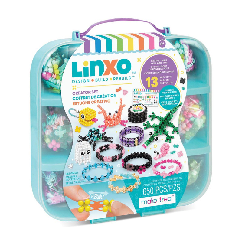 Wykorzystaj ten zestaw Make it Real, aby stworzyć wyjątkową biżuterię lub dekoracje do pokoju. Robienie pięknych przedmiotów to świetna, pobudzająca wyobraźnię kreatywna zabawa, której owocem są niezwykłe ozdoby, stworzone z pasją i zaangażowaniem. Stwórz niezwykłe maskotki i biżuterię z elastycznych i łączonych elementów, które znajdziesz w tym kompletnym zestawie LinXo™! Postępuj zgodnie z instrukcjami, aby stworzyć kilkanaście projektów, albo wykaż się kreatywnością i zaprojektuj własne dzieła przy użyciu 650 elementów, które znajdziesz w tym zestawie. A później rozłącz wszystkie elementy i połącz je tak, by stworzyć kolorowe bransoletki i inne zabawne figurki. Możliwości są nieograniczone! Zestaw zawiera podręcznik z prostymi instrukcjami i obrazkami, aby młodzi projektanci mogli bez problemu tworzyć swoje dzieła.