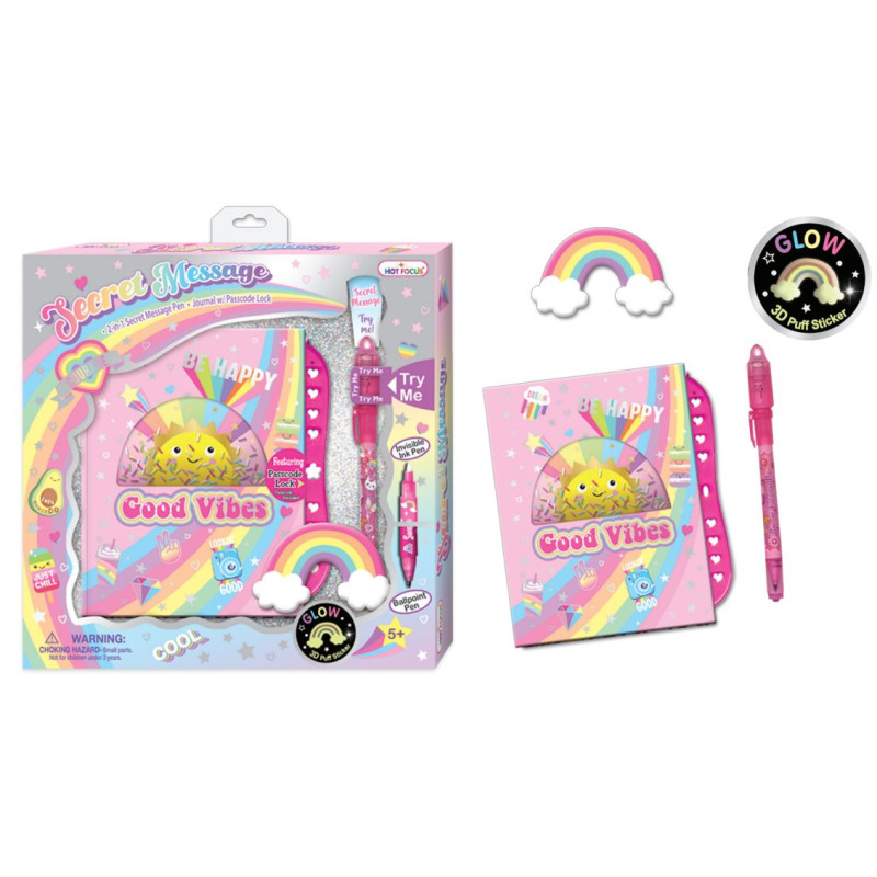 Super pamiętnik z kartkami w linie na szyfr. Do zestawu dołączony jest długopis z dwoma końcówkami – jedna to tradycyjny długopis do pisania, a druga to niewidzialny tusz. Zapiski tym tuszem będą widoczne po podświetleniu ich specjalną lampką UV, która znajduje się w zatyczce długopisu.