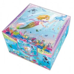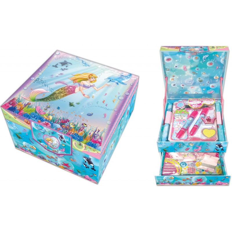 Zestaw z motywem syrenki, zapakowany w kartonowe pudełko ze zdobieniami zamykane na magnes. Po otwarciu wysuwają się 2 szufladki, w których można umieścić akcesoria i dodatkowe drobiazgi.
