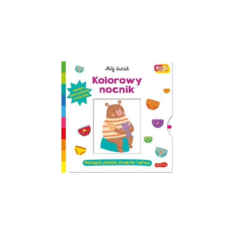 „Kolorowy nocnik” to książeczka, która ma zachęcić dziecko do korzystania z nocnika. Pokazuje dziecku, do czego służy nocnik, i pomaga oswoić się z nim w sposób dowcipny. Dzięki przesuwanym elementom i otwieranym okienkom nauka korzystania z nocnika jest połączona z zabawą, a dziecko samo chętnie sięga po książkę.