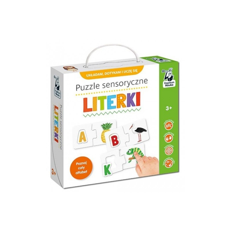 Alfabet bez tajemnic! Puzzle sensoryczne. Literki to zestaw układanek angażujący zmysł dotyku i wprowadzający dzieci w świat liter. W czasie zabawy dziecko ćwiczy koncentrację i motorykę małą – wypukłe elementy zachęcają do wodzenia po nich paluszkiem. Te pomysłowe układanki pomogą dzieciom zapamiętać litery oraz zachęcą do pierwszych kroków w nauce czytania. Zestaw zawiera dwadzieścia cztery trójelementowe układanki (72 elementy) prezentujące litery alfabetu. Każda układanka składa się z: ramki pokazującej kształt litery, literki, której pokryty lakierem kształt można śledzić paluszkiem, grafiki obiektu, którego nazwa zaczyna się głoską odpowiadającą danej literze. Dziecko dopasowuje litery do otworów o zbliżonym kształcie i łączy z kolorowymi ilustracjami. Na puzzlach znajdują się zarówno przedmioty z otoczenia dziecka, jak i dzikie zwierzęta oraz bajkowe postaci. Wszystko po to, bypoprzez ciekawe skojarzenia ułatwić naukę i zapamiętywanie. Elementy układanek można wykorzystać do dodatkowych zabaw wspierających naukę czytania. Pomysły na zabawy zawarte zostały w instrukcji dołączonej do zestawu. Kapitan Nauka to marka, która powstała dzięki rodzicom poszukującym mądrej, pełnej radości, ale i wymagającej rozrywki dla dzieci. Skupiamy się na zagadkach, grach, puzzlach i książeczkach, które ucząprzez kreatywną zabawę i wspomagają rozwój dziecka. Produkty Kapitana Nauki dostosowane są do potrzeb dzieci od narodzin do 11. roku życia. Stymulują rozwój kluczowych umiejętności, takich jak koncentracja, pamięć, spostrzegawczość, myślenie logiczne, kreatywność. Są świetną alternatywą dla smartfona czy komputera, a czas spędzony przy wspólnych rozgrywkach, w gronie rodziny lub rówieśników wzmacnia więzi i umiejętności komunikacyjne.
