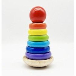 Kolorowe klocki: Zabawka składa się z klocków o różnych rozmiarach i kolorach, które można układać na sobie, tworząc piramidę.