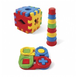 Trzy pomoce edukacyjne w jednym komplecie, a każda z nich rozwija inne umiejętności dzieci w wieku 1-3 lat, które są kluczowe dla ich dalszego rozwoju. Zabawka wymaga od dziecka zaangażowania wielu zmysłów, użycia rączek a tym samym ćwiczenia sprawności manualnej. Podczas zabawy maluch trenuje również zdolność logicznego myślenia.