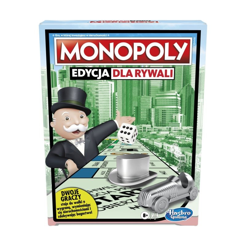 Monopoly edycja dla rywali to gra, w której dwoje graczy staje do walki o wygraną, wymieniając się nieruchomościami i zdobywając bogactwo! Gracze wybierają swój pionek i poruszają się po planszy, kupując, sprzedając i licytując nieruchomości. Karty - Kasa Społeczna i karty - Szansa zwiększają napięcie, gdy gracze próbują zdobyć wszystkie nieruchomości na planszy lub doprowadzić do bankructwa przeciwnika. Ta dwuosobowa gra Monopoly zajmuje mniej czasu niż klasyczna gra Monopoly. To świetny wybór na randkę, zajęcia w deszczowy dzień lub zawsze, gdy twoje dzieci chcą pograć z przyjacielem.