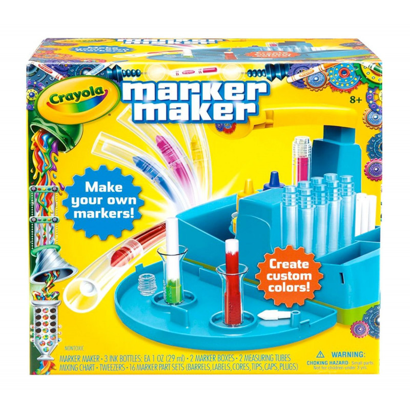 Marker Maker firmy Crayola. Dzięki tej maszynie możesz stworzyć markery w całkiem nowych, niespotykanych kolorach. Możesz zrobić aż 16 różnych flamastrów. W zestawie znajduje się instrukcja mieszania podstawowych barw. Zestaw zawiera: Marker Maker 3 buteleczki z tuszem 2 opakowania na flamastry narzędzia do mieszania elementy do stworzenia 16 flamastrów Wiek 6+