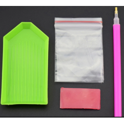 - diamenciki niezbędne do wykonania obrazu, które są posegregowane kolorami w ponumerowanych i oznaczonych symbolami woreczkach,
