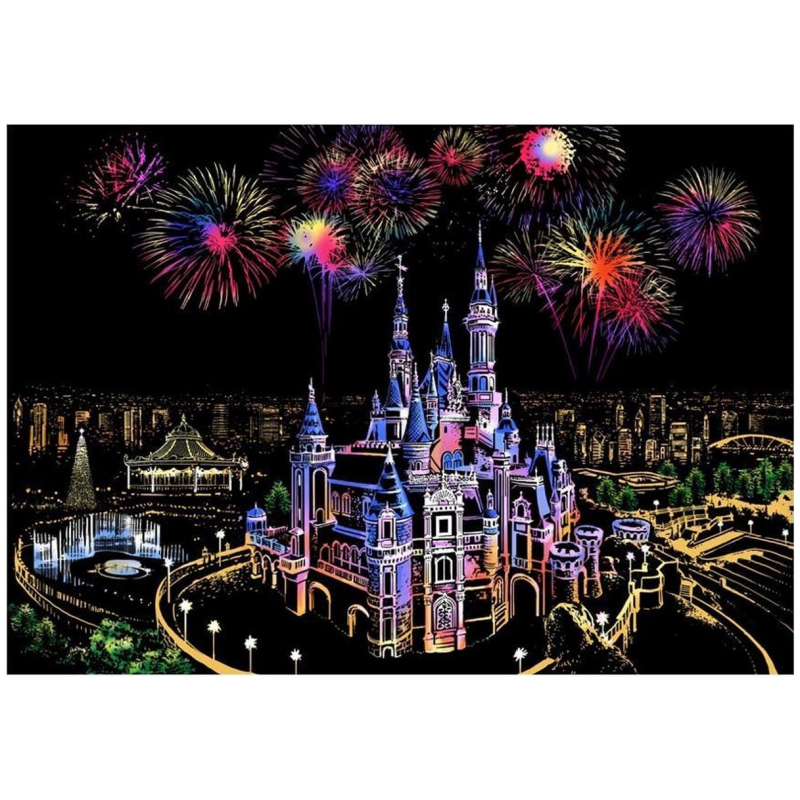 Doskonale przemyślane zastosowanie czarnego arkusza, pozwala na stopniowe wydrapywanie rysikiem poszczególnych elementów obrazów.