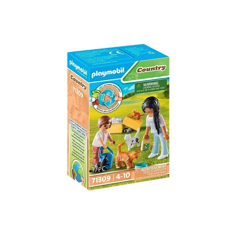 Playmobil Country Rodzina kotków jest 17-elementowym zestawem, który pokazuje dzieciakom, że czas na wsi mija i na sympatycznych obowiązkach! Poznaj szczęśliwą rodzinę kotów! Chociaż są to koty wolno żyjące (i pomagające przeganiać myszy), one też potrzebują uwagi i opieki. Szczególnie teraz, gdy pojawiły się dwa urocze, rozbrykane kocięta! Nakarm maluchy kocim jedzonkiem i nalej im wody. Zestaw Playmobil zapewnia edukacyjną zabawę i inspiruje dzieci do pomysłowego odgrywania ról. Figurki z przyjaznym uśmiechem pomagają przedszkolakom rozwijać ważne zdolności społeczne, manualne i kreatywne.