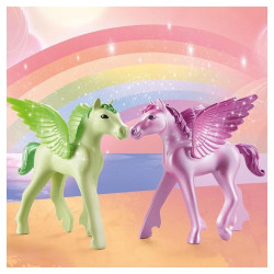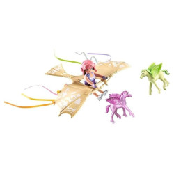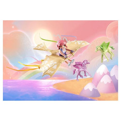 Playmobil Princess Magic przenosi dziewczynki do romantycznej krainy w chmurach, gdzie urocze księżniczki i magiczne stworzenia przeżywają niezwykłe przygody. Niebiańska wycieczka z młodym pegazem jest 21-elementowym zestawem, który zaprasza wszystkie dziewczynki do wzięcia udziału w magicznej podróży. Spójrz, tęczowa królewna szybuje w powietrzu wraz z małymi pegazami! Czarujące postacie Playmobil z serii Princess Magic zachęcają małe damy do puszczenia wodzy fantazji i zanurzenia się w radosnej zabawie w odgrywanie ról.