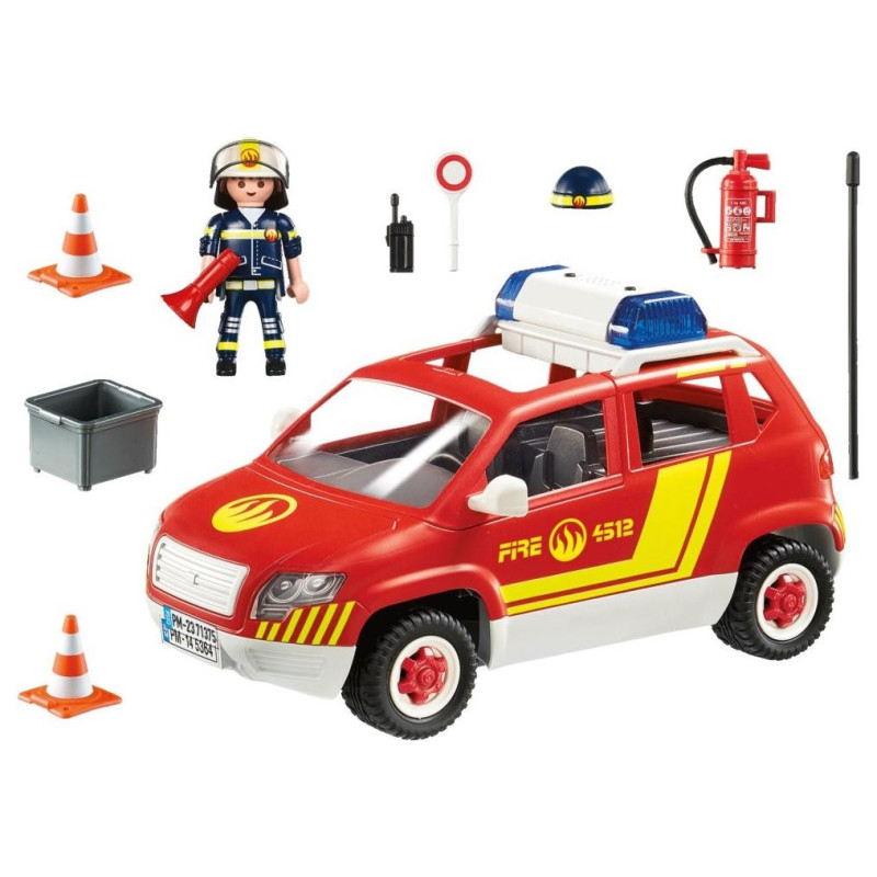 Dowódca strażaków posiada niezbędny sprzęt do zawiadomienia o pożarze, taki jak megafon, lizak, krótkofalówkę, gaśnicę oraz skrzynię z słupkami. W zestawie samochód z akcesoriami i figurka dowódcy. Samochód posiada funkcję otwieranego bagażnika oraz moduł dźwiękowy zamocowany na dachu. Dach pojazdu można zdjąć co umożliwia łatwy dostęp do jego wnętrza.