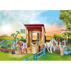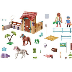 W zamykanych boksach dla kucyków, zwierzęta mogą odpocząć po pracowitym dniu. Kucyki mogą być czyszczone w miejscu przeznaczonym do mycia, a następnie pielęgnowane za pomocą licznych akcesoriów. Boks dla kucyków i elementy ogrodzenia doskonale nadają się do rozbudowy innych dostępnych ogrodzeń i stajni. Witamy w przytulnej stajni na Ranczu Waterfall. Tutaj kucyki mają dużo miejsca na przestronnym padoku i są pod troskliwą opieką. Codzienna pielęgnacja koni odbywa się w miejscu przeznaczonym do mycia, z licznymi akcesoriami do pielęgnacji. Gdy czworonożni przyjaciele są już czyści, mogą odpocząć w zamykanym boksie dla kucyków i cieszyć się porcją świeżego siana. Ta stajnia to marzenie każdego kucyka!