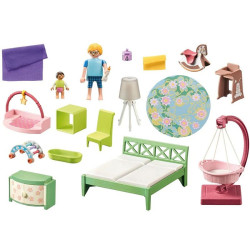Nowoczesna sypialnia PLAYMOBIL z kącikiem zabaw dla dzieci, idealnie nadaje się do zabawy w odgrywanie ról w dziecięcym pokoju. Zestaw do zabawy wykonany z trwałych materiałów, zawierający dwie figurki PLAYMOBIL, łóżko, przewijak i wiele innych dodatków. W sypialni z kącikiem zabaw dla dzieci ważne jest samopoczucie nie tylko rodziców, ale także najmłodszego członka rodziny. Maluch może odpocząć w łóżeczku, a obok dużego łóżka rodziców znajduje się przewijak i miejsce do zabawy. Nowy kolorowy chodzik może posłużyć również jako kołyska. Zestaw przeznaczony do rozbudowy nowego domu z ogródkiem zimowym. Idealny do połączenia z pozostałymi zestawami serii Dom mieszkalny PLAYMOBIL.