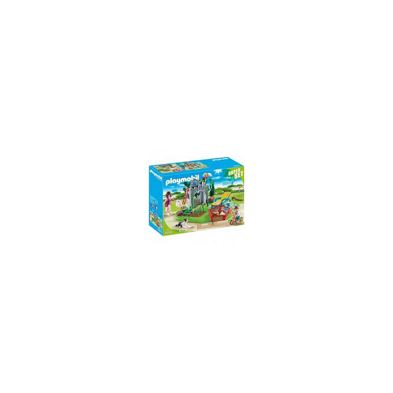Ogród z zagrodą dla małych zwierząt, kwiatkami, warzywami oraz sprzętem do zabawy dla dzieci. To wspaniały komplet uzupełniający kolekcję lub niezależny zestaw do zabawy figurkami i akcesoriami Playmobil.