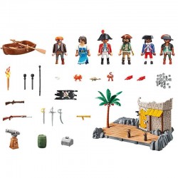 Wyspa Piratów gwarantuje ekscytującą zabawę z korsarzami PLAYMOBIL. Czerwoni nie mają zamiaru oddać swojego bastionu bez walki, ale zaciekli piraci mają własne plany. Kto w końcu zwycięży? Wybierzmy się na ekscytującą piracką przygodę.