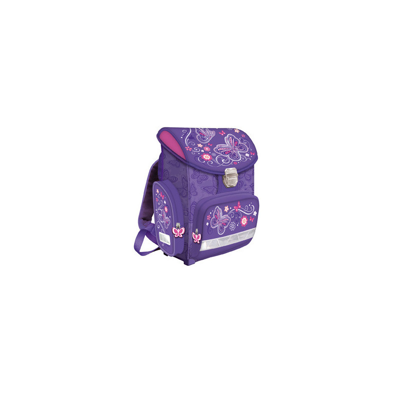 Tornister Butterfly firmy Bambino. Trzykomorowy plecak wykonany z nieprzemakalnych materiałów. Wyposażony został w usztywniane dno i profilowane i usztywniane plecy, wzmacniane szelki z regulacją długości oraz elementy odblaskowe. Posiada 3 kieszenie zapinane na suwak oraz dwie kieszenie boczne. Do suwaka przyczepione zostały przywieszki. Plecak licencjonowany. Wymiary 36 x 27 x 14 cm