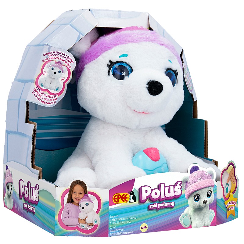 Poluś to przesłodki, interaktywny miś polarny. Został wykonany z miękkiego, przytulnego pluszu i ma śliczne kryształowe oczy z brokatem. Wydaje 10 dźwięków. Po zjedzeniu loda z zestawu, zaczyna chorować i trząść się z zimna. Zaopiekuj się nim i pogłaszcz go, a od razu poczuje się lepiej!