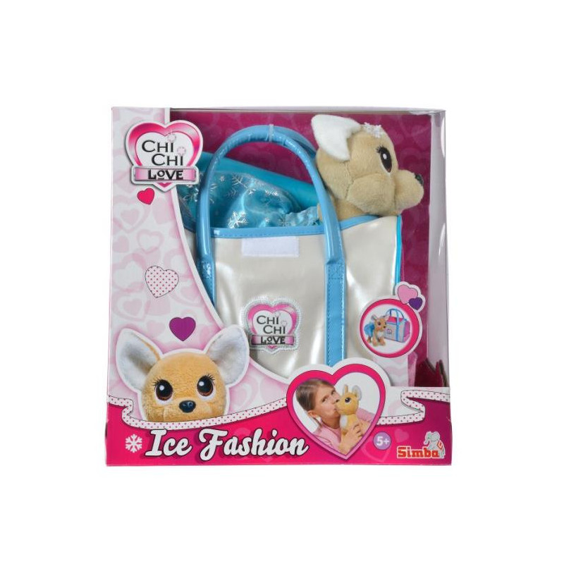 Chi Chi Love Ice Fashion firmy Simba. Mały, uroczy piesek Chi Chi w modnej torebce stanie się ulubieńcem każdej dziewczynki. Piesek ma na sobie niebieską sukienkę w śnieżynki. Całość wykonana z wysokiej jakości materiałów.