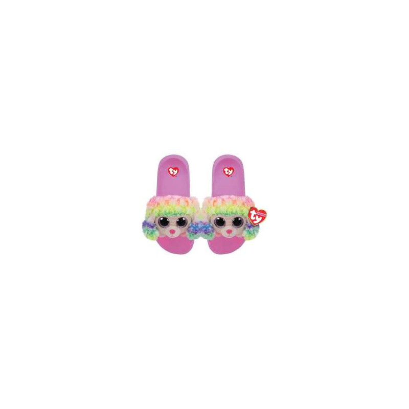 Kapcie pudel Rainbow rozmiar L firmy TY.Kapcie, w których zakocha się każda dziewczynka. Podeszwa wykonana jest z gumy kauczukowej, a pasek i głowa zwierzątka z mięciutkiego pluszu. Idealny pomysł na prezent. Rozmiar L 36-39 Wiek 3+