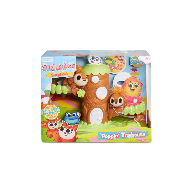 Poppin Treehouse firmy Little Tikes. Domek na drzewie z serii Springlings Surprise wyposażony w wyrzutnię, która może wystrzelić aż 3 zwierzątka na raz. Idealne miejsce do zabaw dla Twoich sprężynujących zwierzątek. W zestawie mama i bobas wiewiórki. Wiek 2+.