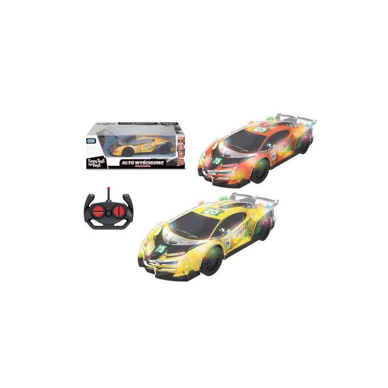 Auto 19 cm., pilot, funkcje: pełen zakres jazdy, migające, kolorowe podświetlenie całej karoserii, działające przednie światła, ustawianie zbieżności kół, gumowe opony, wym. opk: 26 x 12,5 x 9 cm., baterie: auto 3 x AA 1,5V pilot: 2 x AA 1,5V brak w zestawie,