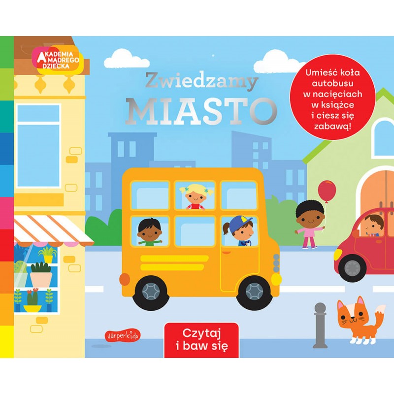 Książeczka opowiada o tym jak wygląda życie w mieście. Zwiedzamy je razem z autobusem, który dołączony jest do książeczki na tasiemce. Autobus musimy wyciągnąć z okładki i postawić w odpowiednich nacięciach na środku pierwszej strony. Dzięki wycięciu w stronach autobus jedzie z nami przez kolejne strony książeczki. Razem z nim jedziemy ulicą miasta mijając domy, dzieci, i inne samochody. Mijamy park w którym dzieci bawią się na zjeżdżalni oraz przejeżdżamy przez tunel. Na każdej stronie mały czytelnik ma krótkie pytanie wymagające pokazania lub policzenia.