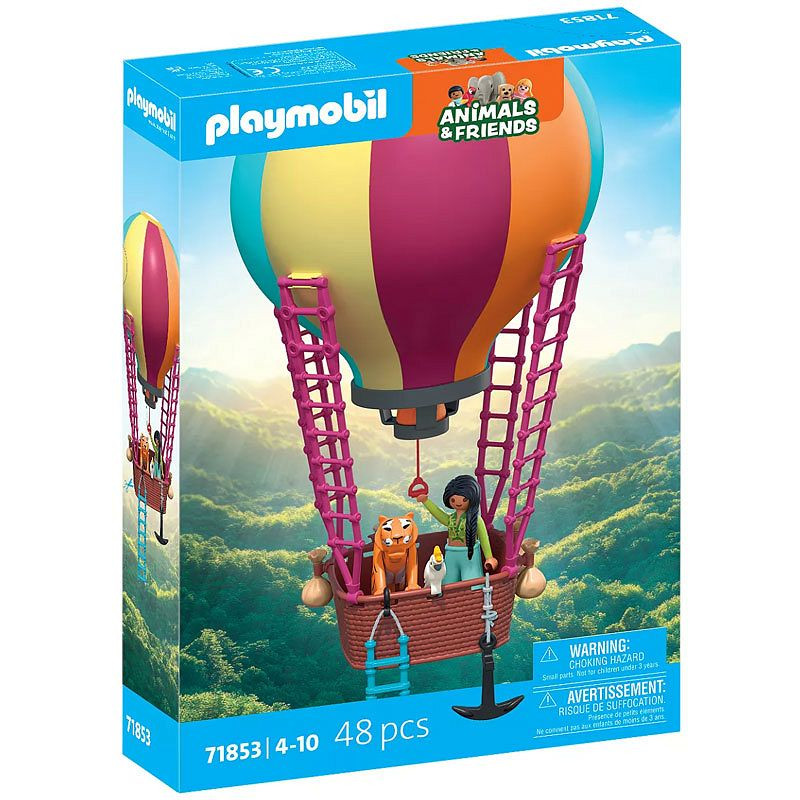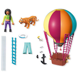 Playmobil Lot balonem. Świat widziany z lotu ptaka jest jeszcze piękniejszy! Niedaleko kolorowej willi możliwe jest odbycie lotu balonem, aby odkryć magiczny świat Animals & Friends z powietrza. Wejdź do kosza i daj się oczarować. Tygrys bacznie obserwuje trasę lotu, podczas gdy kakadu, jego mały pomocnik, chętnie go wspiera i podziwia widoki z wiszącej drabinki linowej. Kapitan dba o palnik gazowy podczas lotu i odpowiedzialnie decyduje, kiedy jeden z worków z piaskiem zwisających z kosza musi zostać zrzucony, aby bezpiecznie wylądować.