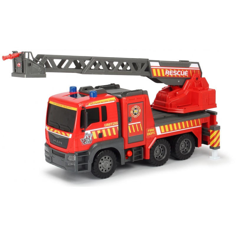 Samochód straż pożarna firmy Simba. Samochód z obrotową drabiną i pompką do jej sterowania, wysuwanymi kotwami, wolne koła i otwierany schowek na sprzęt. Do zestawu dołączono dwa pachołki. Wykonany z wysokiej jakości materiałów. Długość 54cm Wiek 3+