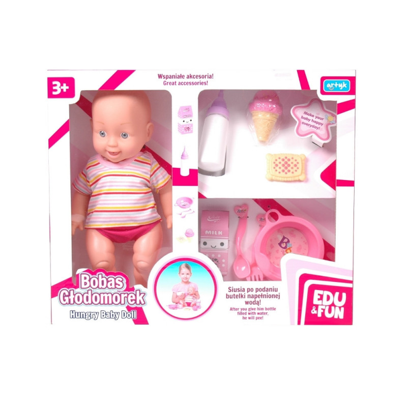 Lalka Głodomorek z akcesoriami firmy Artyk. Lalka bobasek, która pije i sika po podaniu butelki z wodą. W zestawie z butelką, lodowym rożkiem, sztućcami, miseczką i kartonikiem mleka . Całość wykonana z wysokiej jakości materiałów. Wiek 3+ Ostrzeżenie:Nieodpowiednie dla dzieci w wieku poniżej 36 miesięcy. Małe części.