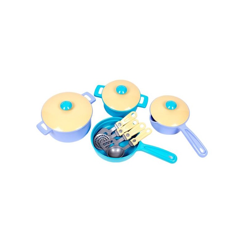 Zestaw naczyń obiadowych. W skład kompletu wchodzą: dwie patelnie, dwa garnki z przykrywkami oraz zestaw narzędzi kuchennych.