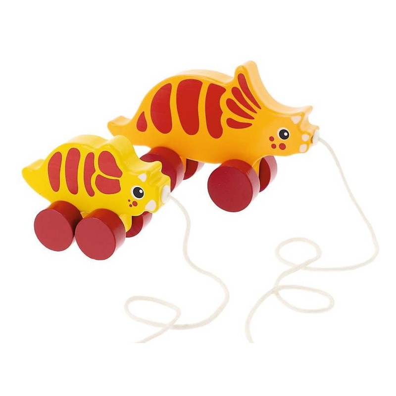 Zabawki posiadają kółeczka, ze sznurkami do ciągnięcia.