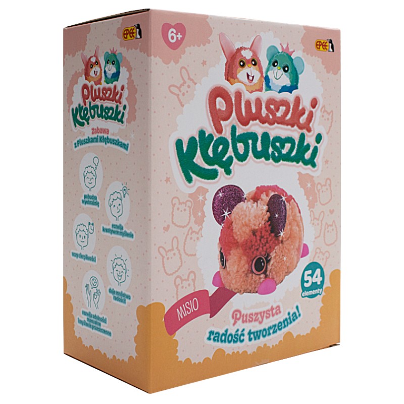 Pluszki-Kłębuszki to urocze pluszaki do samodzielnego zrobienia. Twórz, stylizuj je i baw się kolorami. Zabawa polega na przyklejaniu odpowiedniej porcji włóczki na korpus Pluszka - Kłębuszka, łącznie można stworzyć aż 12 różnych wzorów.