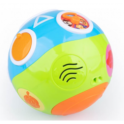 Zabawka mówi po polsku, ucząc nazw cyferek oraz kształtów, a także odtwarza wesołe melodie i błyska światełkami. Dodatkowo, zabawnie wiruje, „uciekając” przed maluchem i grzechocząc przy tym koralikami, ukrytymi w jednej ze ścianek. Przełącznik trybu umożliwi szybkie przejście z nauki w opcję zabawy oraz całkowite wyłączenie dźwięków po zakończonej zabawie.