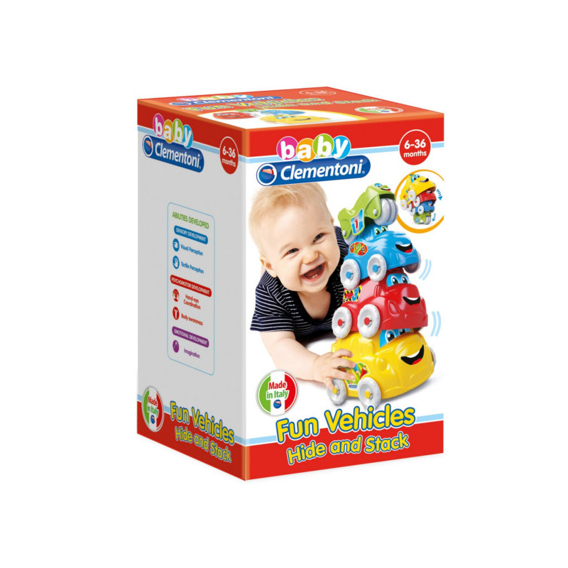 Wieża z autek z serii Baby firmy Clementoni. W zestawie 4 pojazdy: ciężarówka, autobus, samochód i motocykl. Układaj je na sobie w wieżę, wkładaj jeden w drugi w wielu różnych kombinacjach. Zabawka wykonana z wytrzymałych i bezpiecznych dla dziecka materiałów. Wiek 6 miesięcy+