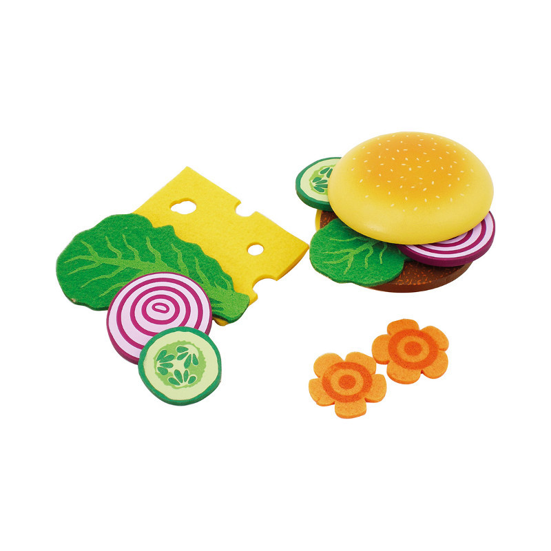 Zestaw Hamburger firmy Brimarex. Zestaw składający się z 12 drewnianych elementów, z których można złożyć hamburgera. Całość wykonana z wysokiej jakości, ekologicznych materiałów.