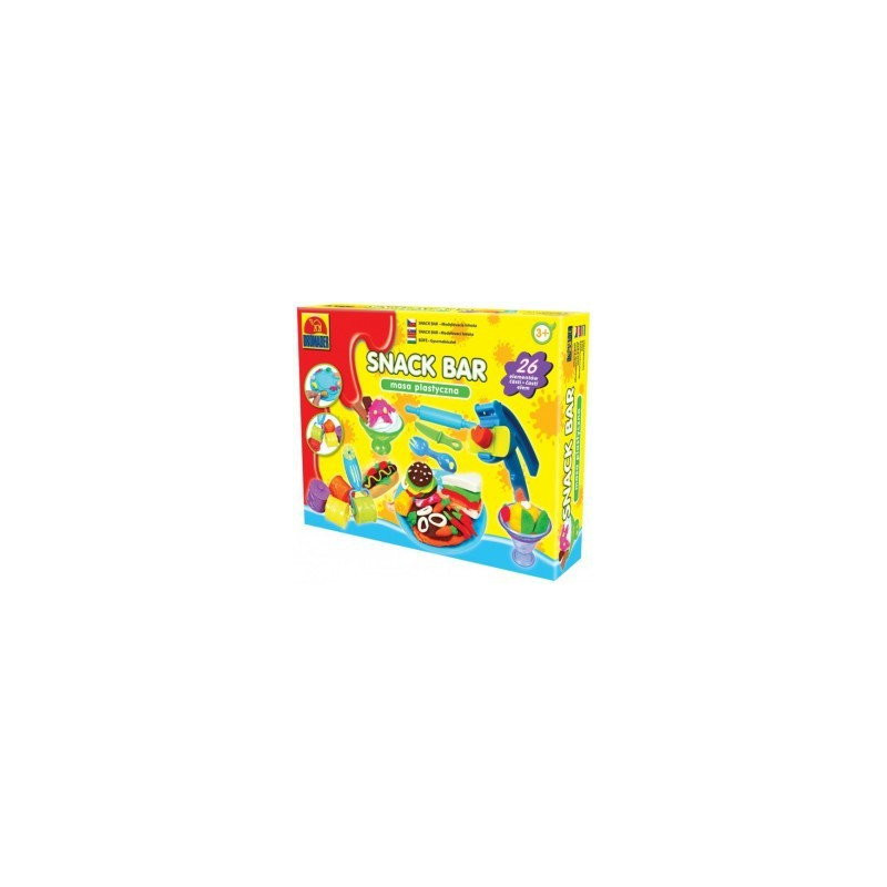 Masa plastyczna Snack Bar firmy Dromader. Masa plastyczna z której możesz wykonać przeróżne kształty. Zestaw zawiera 4 tuby masy plastycznej oraz mnóstwo akcesoriów i foremek, przyborów i wyciskarkę dzięki czemu zapewni wiele godzin wspanialej zabawy. Wiek 3+