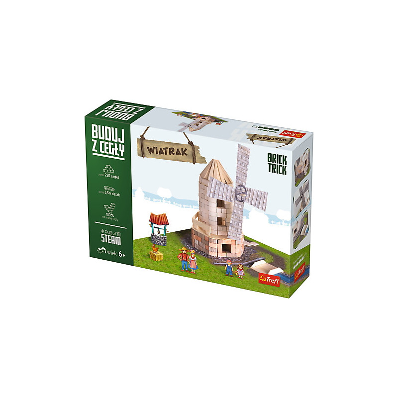 Brick Trick Wiatrak firmy Trefl. Zostań konstruktorem i wykorzystuj prawdziwe cegły i drewno. Wykorzystaj dołączone plany budowy lub wymyśl coś samodzielnie. Rozpuść konstrukcję i buduj od nowa. Zestaw zawiera mnóstwo elementów do kreatywnej zabawy. Wiek 6+