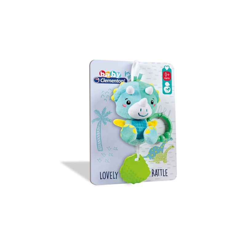 Grzechotka z miękkim, pluszowym dinozaurem, która zapewni niemowlęciu rozrywkę podczas pierwszych miesięcy jego życia.