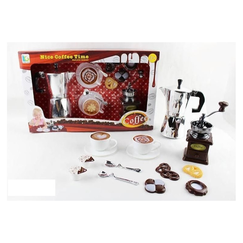 W zestawie 14 elementów. Wszystko co potrzeba do przygotowania smacznej, włoskiej kawy - kawiarka, młynek do kawy, filiżanki ze spodkiem, łyżeczki, śmietanki, ciasteczka.