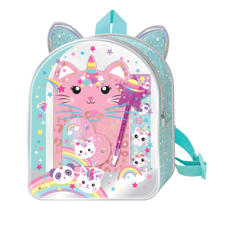 Zestaw zapakowany w plecaczek z brokatem i regulowanymi paskami.